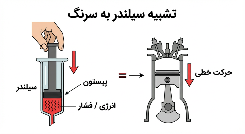 برای درک بهتر، سیلندر را میتوان به بدنه یک سرنگ یا پمپ دستی تشبیه کرد. در این تمثیل، بدنه لولهای و استوانهای، نقش سیلندر را دارد و قطعه لاستیکی که درون آن جلو و عقب میرود، نقش پیستون را ایفا میکند. هنگامی که پیستون در داخل سیلندر حرکت میکند، نیرو را منتقل کرده یا سیال (گاز یا مایع) را فشرده میسازد. در واقع، این محفظه استوانهای نیروی سیال (روغن یا هوا) یا نیروی انفجار سوخت را به نیروی مکانیکی خطی تبدیل میکند.
